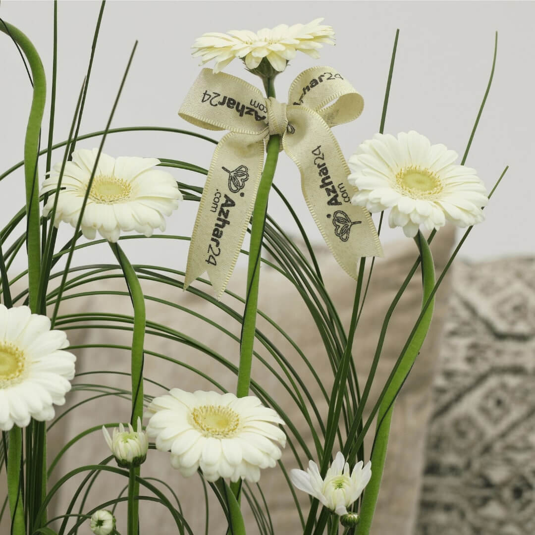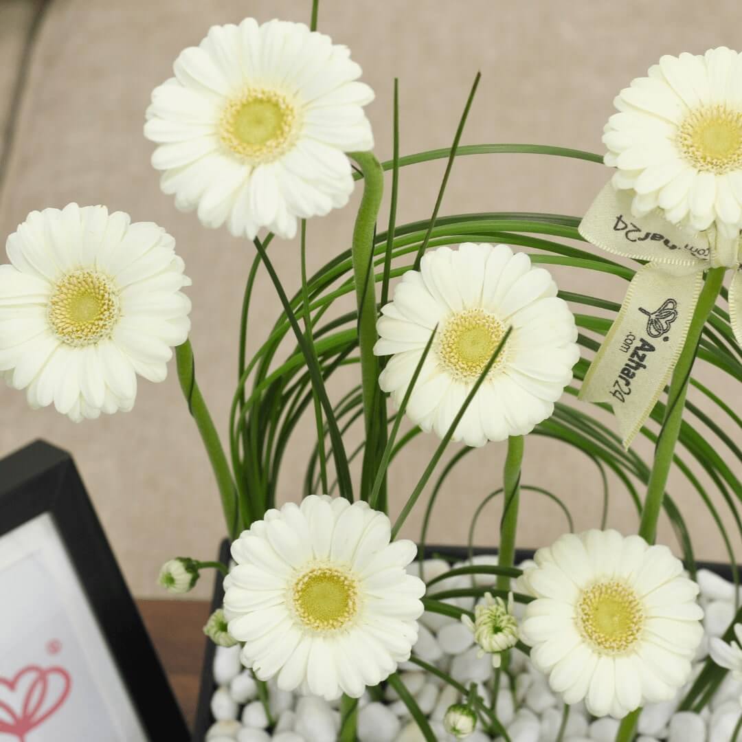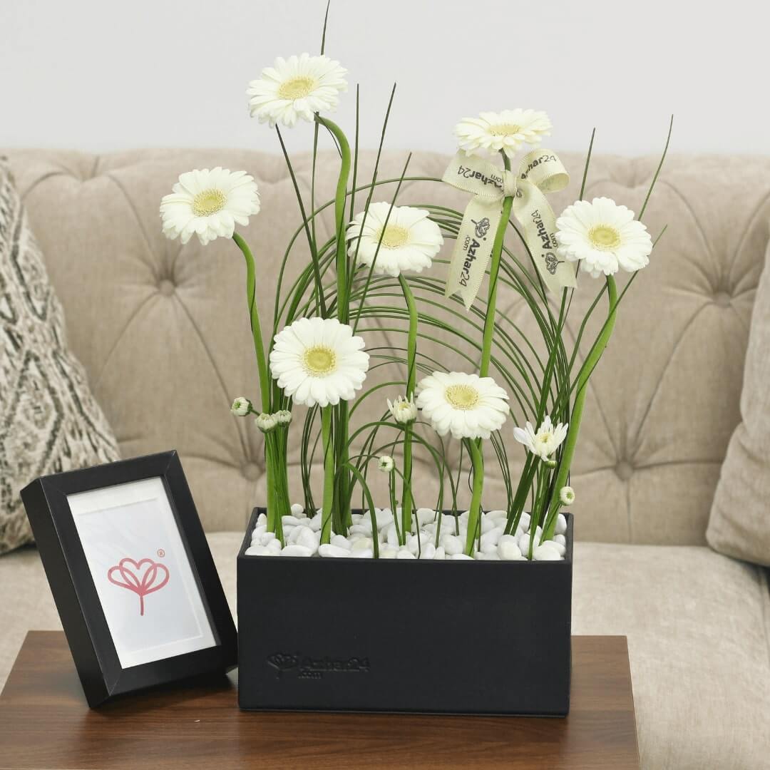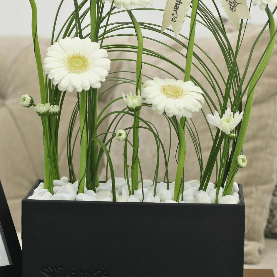 Flower box featuring 7 white gerbera with steel grass in a black box with white stones.